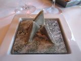 First of all, you are presented with a live and fresh peanut in a puffed peanut cookie, light and crisp like a rice flake. Then follow a handful of exclusive, rich raisins and a blue cheese biscuit, presented on a white napkin. At the slightest touch of a fork, it goes into brittle bits like glass. Perfect!