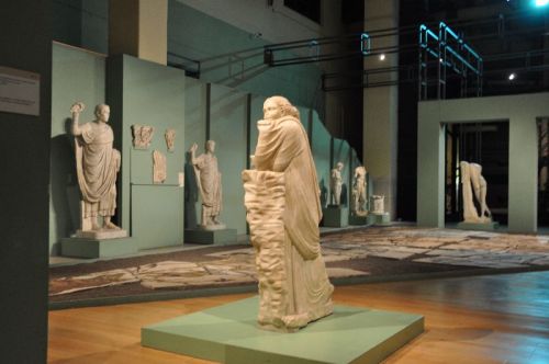 There are more than 400 sculptures at the Centrale Montemartini, including classical works as well as Roman copies of Greek art that once graced the temples of the city as well as the luxurious aristocratic and imperial villas. They were mostly unearthed in the 19th century and in the 1930s. Many come from the site of the ancient Forum. Among many of the remarkable pieces dating to the Roman Republic is a sculpture by Togato Barberini depicting a highborn Roman carrying a bust of a no less exalted personage in each hand. The work represents a tradition popular in the sculptor's time - casting the effigies of one's ancestors to carry them at various ceremonies, thereby showing respect for one's forebears.