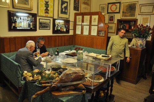 The joy of travel, as most travellers realize, is composed of tiny surprises. Rome is ideal for encountering astonishing little things. You might think that it's completely impossible to seek the essence of the city where flocks of tourists have gathered for generations, for instance - you wouldn't expect a restaurant near the Trevi fountain to cater mostly to locals, say. But Rome is never predictable. Al Moro bears witness to that fact. Open since 1929, it's only a hop, skip and a jump from the fountain - but it has hidden itself in a small side street, its sign barely noticeable. Tourists do come in, of course, but the secret is guarded nonetheless - you won't be spurned, but you may feel a slight chill of arrogance masked in politeness. Accept that as the rules of the game, or pretend you're acting in a movie - Al Moro attracts politicians, but it's also the haunt of stars and honchos from the legendary Cinecitta, the heart of the Italian film industry. They still dine here, so uninvited guests are interlopers, at least to a degree - like unknown visitors who've wandered into a private ball. The ambience is colourful, though. All of the waiters are ancient, not particularly attentive, and somewhat loud. They maintain their self-esteem, if anything. There are a great many of them, and they move like jugglers bearing dishes to the tables, presided over by the proprietor - Moro's son, who is also advanced in years. The menu is traditional and homely, with fantastic artchokes alla Romana and one of the best spaghetti alla vongole in the Eternal City. The interior is that of a home, also - a home owned by someone who doesn't want to part with anything. All kinds of paintings and drawings blend with photographs of past diners, from statesmen and giants of literature and art to Fellini. Add the awards the restaurant has received over the years, and you can't see the walls. The cabinetry is from the old days, and the foyer is fabulous - if it's mushroom season, it's filled with fungi in lovely wooden boxes, along with the necessary artichokes and meats, a gourmet's dream.