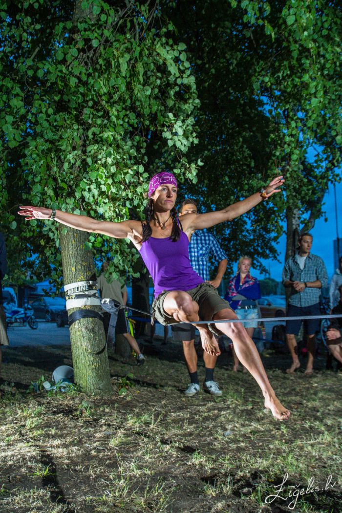 Once a year an adventure organization "Lūzumpunkts" in Andrejsala is pulling lines and holding a Slackline party. It's a tradition started 4 years ago. The underlying idea of the very first party was to clean the only remaining green area in Andrejsala, supplementing the event with a slackline activity. This year's Slackline party attracted a record number of participants. Approximately 60 slackline experts, fans and enthusiasts gathered on 8th of July, about 20 lines were pulled and competitions took place both in longline and jibline disciplines.